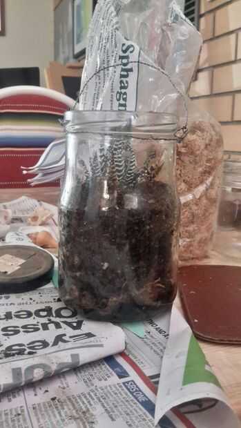 suavemente Coloque su planta en la cáscara y espolvorear algunos suelo sobre las raíces. no necesita mucho. no compacta como la ligereza evita el crecimiento de hongos. rociar con agua, no verter como esta sobre el agua. para los frascos hagan lo mismo, dejar un amplio espacio en la parte superior libre por lo que se ve bien (que en la foto tiene demasiado suelo!). Usé las plantas de zona húmeda en mis frascos y cerrado después de la siembra, que significa que no regarlas a menudo. la cáscara que rociar sobre una vez por semana.