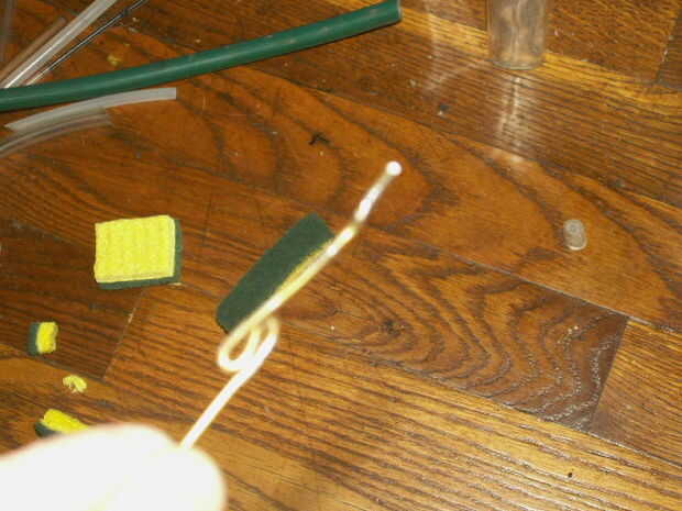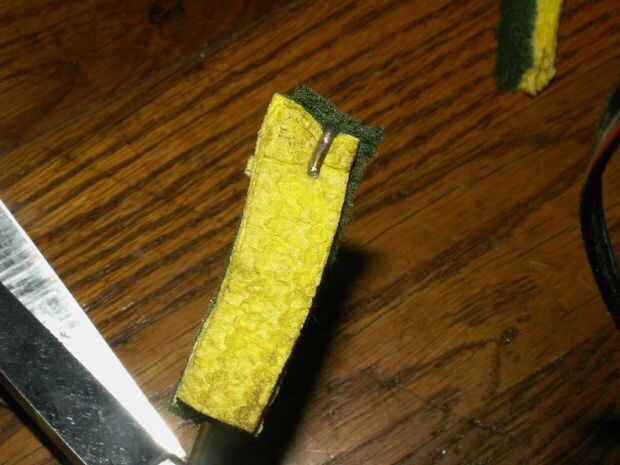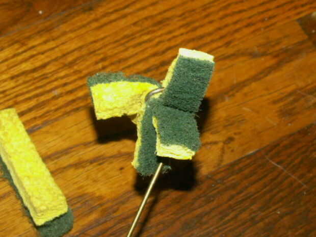 Tomar sus alicates para doblar un gancho en un extremo entonces lugar yoru esponja tira en él y doblar el gancho cerrado para asegurar la esponja,