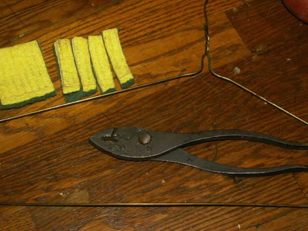 OK la primera curva de la parte inferior de una percha de alambre. Luego corte un plato de esponja en tiras pequeñas.