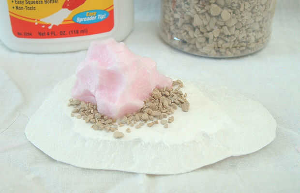Ahora para añadir las pequeñas rocas (camada de arcilla). Estos pueden colocarse en cualquier lugar pero prefiero ponerlas alrededor de la base de la roca grande y a veces corriendo cerca de la playa. Añadir una cantidad generosa de pegamento blanco a su área de la blanco, espolvorear generosamente con rocas, suavemente presione en el pegamento y deje secar. Sacuda el exceso.