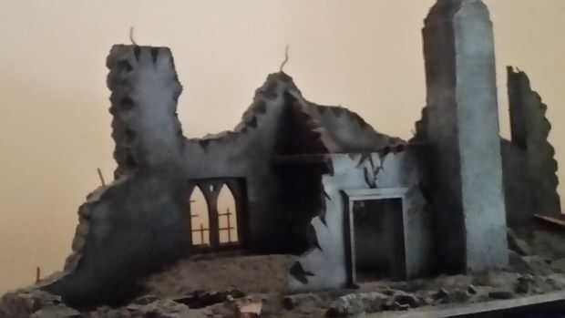 A arruinado gótico Catedral, roto por la mitad por el bombardeo. Escala para figuras de 28mm, base de las medidas 60 cm x 30 cm (24 en x 12 adentro), altura máxima de 45cm (9 pulgadas). Mano de foamboard, barra de plástico, poliestireno y alambre. Pintados a mano. Cualquier comentarios/críticas muy Bienvenido!