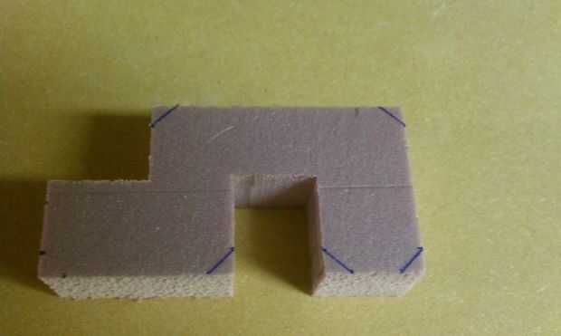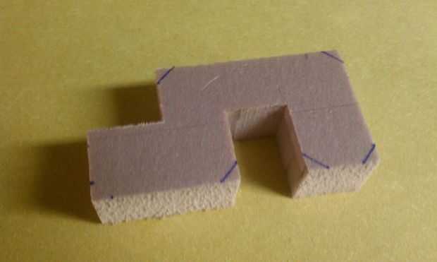 Dibujar la forma básica que quieras sobre el poliestireno con un bolígrafo de punta fina.  Intenta hacer cada sección del mismo ancho en ambas direcciones. A continuación utilice una sierra de banda, sierra para metales o cuchillo de sierra para cortar esta forma básica. Trate de usar cortes rectos para hacer esto, con ayuda para retirar las secciones cóncavas. Lo siguiente corte chamfers de las esquinas exteriores (aparece marcadas hacia fuera por debajo). Yo entonces enarenó ligeramente todas las caras con papel de grano arena 200 para que todos los lados tengan la misma textura.