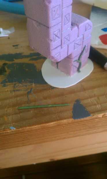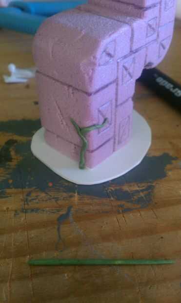 Corte base común de tarjeta lo suficientemente grande para dar cierta estabilidad al pilar. Usé un cuchillo de la manía para esto. Adhiera el pilar con pegamento. Asegúrese de que usted prueba su colas y pinturas en la espuma antes de utilizar su modelo. Usé pegamento gorila. A continuación añadí vides al pilar. Mezclar algunas cosas verdes. Rollo en tiras sobre una mesa lisa. Mójese las manos al aplicar a las vides a la espuma de poliestireno o la materia verde se pegará a usted más que el pilar.