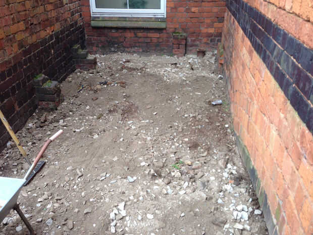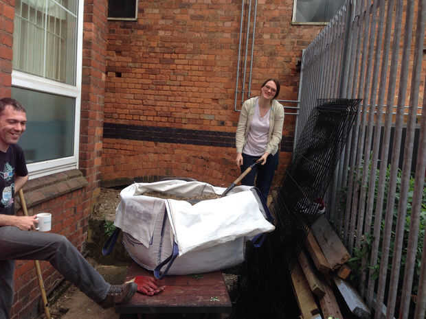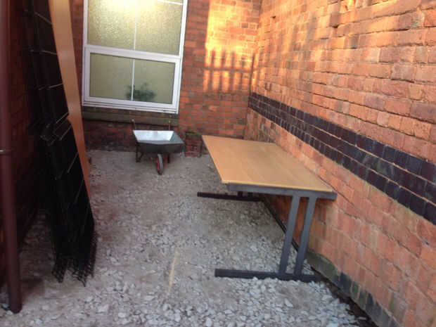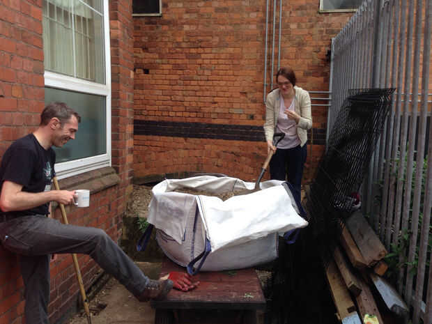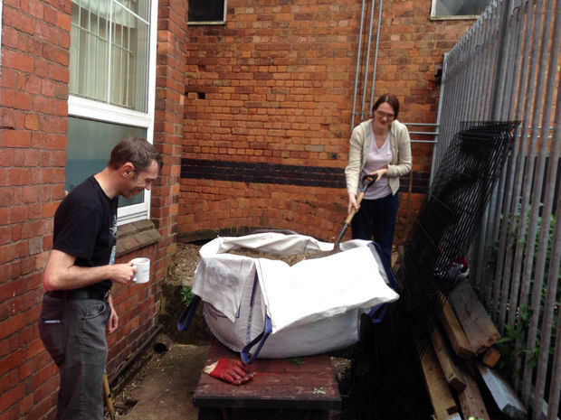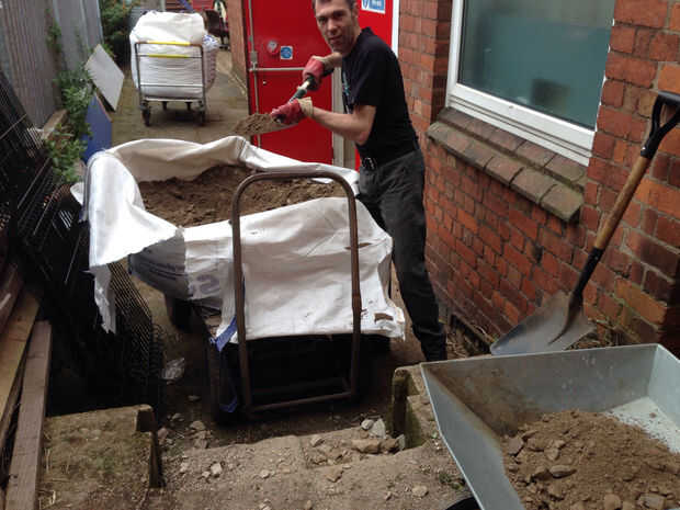 Nos podríamos haber pensado que el injerto duro terminó cuando nos habíamos despejado con éxito el terreno de malezas y escombros. No debía ser - la próxima etapa era aún más difícil! Tuvimos que poner dos toneladas de MOT1 hardcore a mano. Debido a la disposición de la zona, incluso una carretilla era inútil, por lo que todo el trabajo se realiza con palas y picas. Una vez que lo tenía puesto, nos había rastrillada hacia fuera y aplanado lo mejor que podía. Idealmente en este punto habría contratado una placa whacker para compactar abajo correctamente, sino porque nuestro presupuesto no podría estirar a él, tuvimos que hacer hacer y compactarla lo mejor que pudimos sin uno.