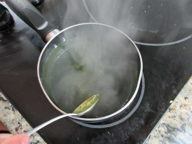 Tomar la mezcla de espinacas que acaba de hacer y viértala en una cacerola sobre fuego medio. Disolver el agar-agar a la mezcla de espinacas. Poner esta mezcla a hervir y no se olvide de remover constantemente. Una vez que hierva, retirarla del calor y nivelado de la mezcla para eliminar impurezas.