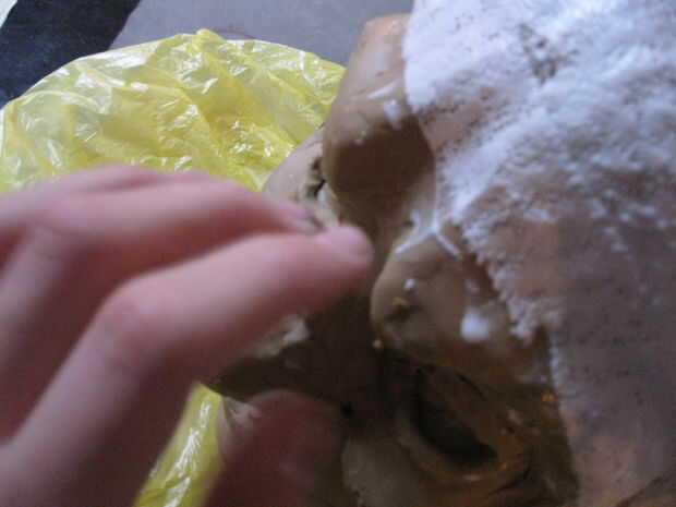 Antes de aplicar el yeso, puede ser una buena idea para aplicar algún tipo de desmoldeante - una sustancia aceitosa o con jabón que ayuda al molde de yeso. Hemos encontrado que vaselina parece funcionar bastante bien, si no se usa intencionado. Una capa delgada, aunque sólo en las partes difíciles alrededor de la nariz y los ojos, realmente te puede ayudar más adelante.