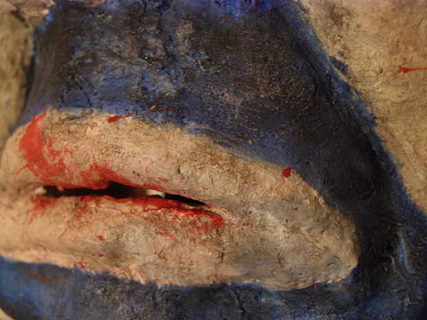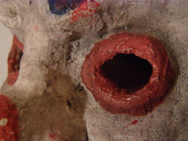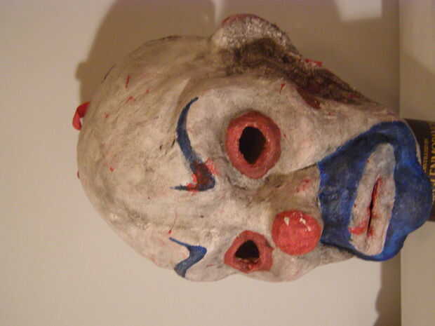 Ahora para la diversión parte: en la película la máscara es muy Grunge y sus colores son algo sosos. El blanco del yeso es manera demasiado blanco, lo que tienes que hacer es poner un poco de pintura negra en el dedo o al principio un cepillo y se mezcla mucho con agua. Ahora con las manos y dedos frote esta materia acuosa gris todo su máscara y hacer que una capa desigual bas de gris. Es mejor si lo haces con las manos por lo que es irregular y tiene una textura fresca. Ahora es necesario destacar con el gris más oscuro las hendiduras en el máscara por ejemplo alrededor de los ojos y en las esquinas de la papada. Referencia aquí no es realmente imprescindible, usted puede ser creativo, por ejemplo me ha gustado la textura unsmoothed de mi máscara mucho así que hice un parche áspero que parecía quemado y sangrienta.
