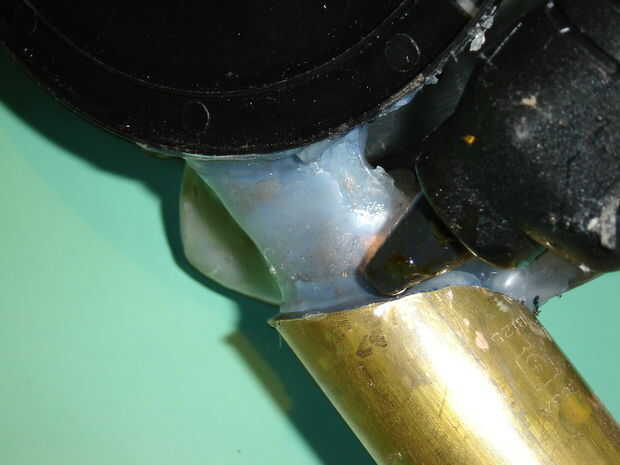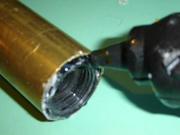 Comencé agregando un Céspol de latón, cortando el extremo por lo que conformaría para el caso de la turbina y de corte para montar sobre el mango de entrada de líquido. Esta pieza fue caliente pegado firmemente en su lugar y se convierte en el mango. (Asegúrese de que hay espacio para accesorios, válvula de cierre, etc.).