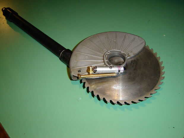 Bueno, ok, originalmente test pase la hoja de sierra sin guardia y sin un eje para mantener la cuchilla Viví a través de él, no otra vez! Mi nueva configuración es mucho más robusto, con poca o ninguna posibilidad de hoja fly-off. Hay un guardia y un eje estacionario conectado a una placa atornillada. Todo funcionó muy bien durante la ceremonia de PumpkinCuttin, que la guardia tiene conectada con tripas de calabaza y había ralentizado la hoja!