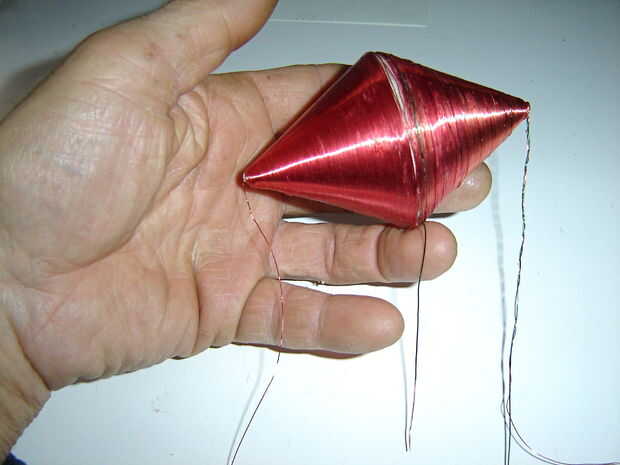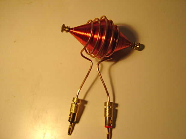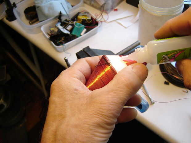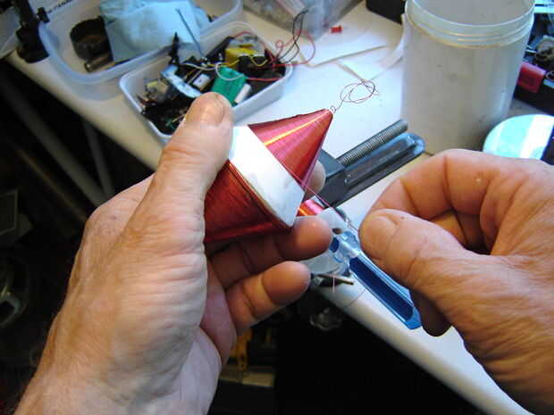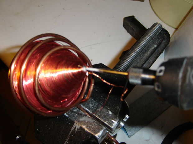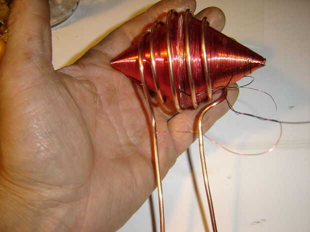 Las bobinas cónicas de alambre 30 calibre se hieren laboriosamente a mano. El grueso del alambre de cobre 10 gage estaba doblado cuidadosamente para ajustarse a la bobina de fútbol sin molestar a las bobinas de la bobina. (Nota a sí mismo... no intentarlo de nuevo sin el recubrimiento de los cables con una resina o pegamento en primer lugar, porque las bobinas comenzará a desentrañar...)