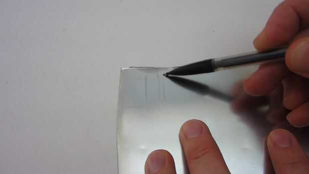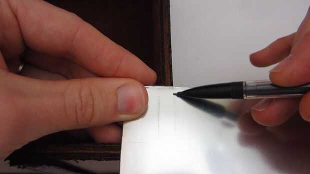 En una esquina, trazó el contorno del interruptor. En el lado donde sobresale el botón, he marcado otra línea que se compensó con la misma distancia que el grueso del lado de la caja. Entonces dibujé una tercera línea que fue desde la segunda línea por aproximadamente 1/4 de pulgada. Corté la pieza a lo largo de las líneas más exteriores. Repita este proceso para hacer una segunda pieza idéntica.
