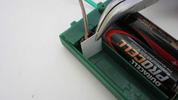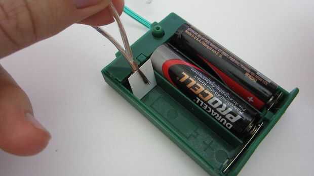 Para conectar el interruptor de la luz, tomar el extremo libre de un cable y enróllelo alrededor de la primavera del extremo negativo de la batería. Luego coloque un pedazo pequeño de papel o tarjeta stock frente a la primavera. Coloque el extremo libre del segundo cable al otro lado de la tarjeta. Por último Inserte la batería. La presión de la fuente debe mantener los cables en su lugar. La tarjeta separa la batería de la terminal para que el interruptor es la única manera de completar el circuito. Esta es la forma más sencilla de añadir un conmutador adicional a la luz sin modificarlo permanentemente.