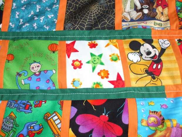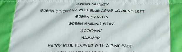 La parte superior se hace con pedacitos de kid tipo tela en mi escondite de sobras, en la parte trasera de la colcha es la lista de cosas para buscar en la parte delantera... Esto es perfecto para un 3 o 4 años aprender solo a leer... Mantiene debajo o encima de la colcha!