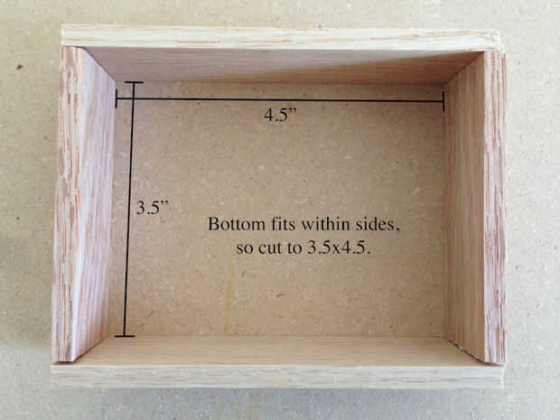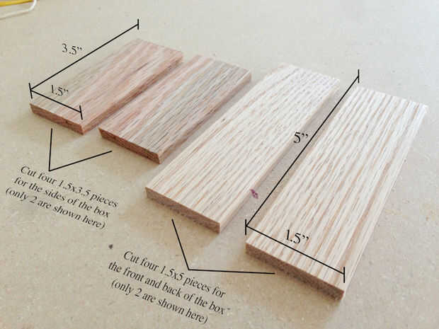 Para los lados corta cuatro piezas de 1.5x3.5 (dos para cada lado). Para el frente y la parte posterior de la caja, cortar cuatro 1.5x5. Véase el cuadro arriba.