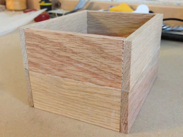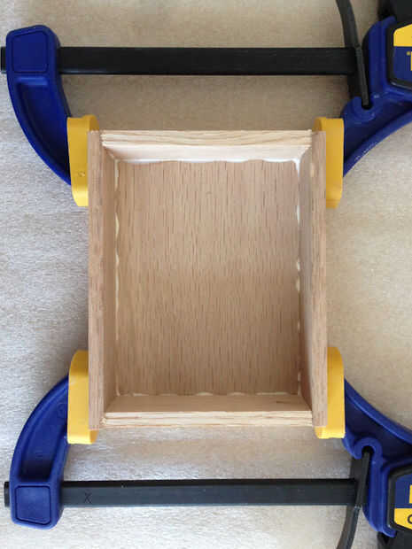 Utilice pegamento para madera para montar la parte inferior de la caja. Consiste en la pieza inferior, una pieza frontal, una parte posteriora y dos lados. Apretar y dejar secar.