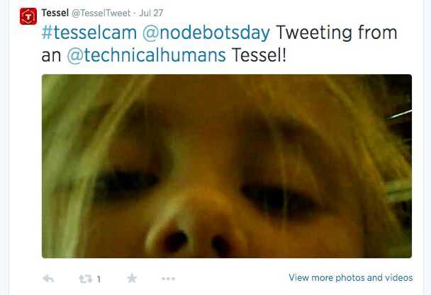 <p>var location = 'San Francisco' // Write where you're tweeting from!<br> // Node requires var fs = require('fs'); var https = require('https'); var crypto = require('crypto'); // Set up to Tweet var bound = require('crypto').pseudoRandomBytes(16).toString('hex'); var ctype = 'multipart/form-data; boundary=' + bound; // Tweeting as var oauth_consumer_key = "O7oc0pvsZn4xjgcuHuYdX4FaC"; var oauth_consumer_secret = "iJYuHFz2sD46Nvk3mcwzX8uih14aEAMgVWdWoR59nx8v6Zl7ZX"; var oauth_access_token = "2529232909-luARGU89K4CKFMvfzBjCgG6ubefzDkdDWkSB85i"; var oauth_access_secret = "GXQfuzvGdjLEs3t1HEYfhQ9x9bdBcSBVXjBkbRgwYlOE0"; // Get time var curtime = parseInt(process.env.DEPLOY_TIMESTAMP || Date.now()); // Set up OAuth var oauth_data = { oauth_consumer_key: oauth_consumer_key, oauth_nonce: require('crypto').pseudoRandomBytes(32).toString('hex'), oauth_signature_method: 'HMAC-SHA1', oauth_timestamp: Math.floor(curtime / 1000), oauth_token: oauth_access_token, oauth_version: '1.0' }; var out = [].concat( ['POST', 'https://api.twitter.com/1.1/statuses/update_with_media.json'], (Object.keys(oauth_data).sort().map(function (k) { return encodeURIComponent(k) + '=' + encodeURIComponent(oauth_data[k]); }).join('&')) ).map(encodeURIComponent).join('&'); oauth_data.oauth_signature = crypto .createHmac('sha1', [oauth_consumer_secret, oauth_access_secret].join('&')) .update(out) .digest('base64'); var auth_header = 'OAuth ' + Object.keys(oauth_data).sort().map(function (key) { return key + '="' + encodeURIComponent(oauth_data[key]) + '"'; }).join(', '); function post (status, file) { var req = https.request({ port: 443, method: 'POST', hostname: 'api.twitter.com', path: '/1.1/statuses/update_with_media.json', headers: { Host: 'api.twitter.com', 'Accept': '*/*', "User-Agent": "tessel", 'Authorization': auth_header, 'Content-Type': ctype, 'Connection': 'keep-alive' } }, function (res) { console.log("statusCode: ", res.statusCode); console.log("headers: ", res.headers); res.on('data', function(d) { console.log(' '); console.log(' '); console.log(String(d)); }); }); req.write('--' + bound + '\r\n'); req.write('Content-Disposition: form-data; name="status"\r\n'); req.write('\r\n'); req.write(status + '\r\n'); req.write('--' + bound + '\r\n'); req.write('Content-Type: application/octet-stream\r\n'); req.write('Content-Disposition: form-data; name="media[]"; filename="test.jpg"\r\n'); req.write('\r\n'); req.write(file); req.write('\r\n'); req.write('--' + bound + '--\r\n'); req.end(); req.on('error', function(e) { console.error(e); }); } var tessel = require('tessel'); console.log('Connecting camera...'); var camera = require('camera-vc0706').use(tessel.port['A']); camera.on('ready', function(err) { if (err) return console.log('not ok - error on ready:', err); console.log('Camera connected. Setting resolution...'); camera.setResolution('vga', function(err) { if (err) return console.log('not ok - error setting resolution:', err); console.log('Resolution set. Setting compression...'); camera.setCompression(100, function(err) { if (err) return console.log('not ok - error setting compression:', err); console.log('Compression set.'); console.log('Camera ready. Press Config button to take a picture.'); tessel.led[1].high(); tessel.button.on('press', function () { console.log('Taking picture...'); tessel.led[3].high(); camera.setCompression(100, function(err) { camera.takePicture(function(err, image) { if (err) return console.log('Error taking Picture:', err); console.log('Picture taken. Posting...'); post('Tweeting from #tesselcam! ' + location, image); tessel.led[3].low(); }); }); }); }); }); }); camera.on('error', function (err) { console.log('Error: ', err); });</p> - Crear una carpeta.