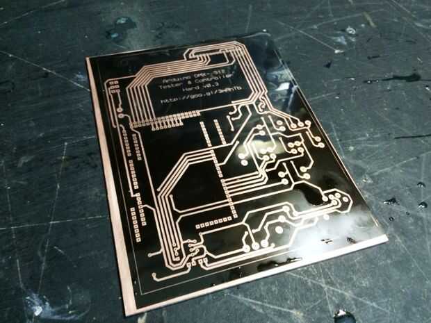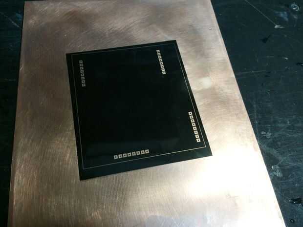 Con los archivos de Proteus mandamos a imprimir un acetato pre-prensa en negativo (hay un PDF con dicho archivo)