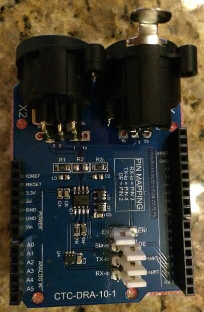 Usé un escudo de DMX - modelo: CTC-DRA-10-1, bajo costo, no aisladas que puede adquirirse en Ebay por unos $15.00