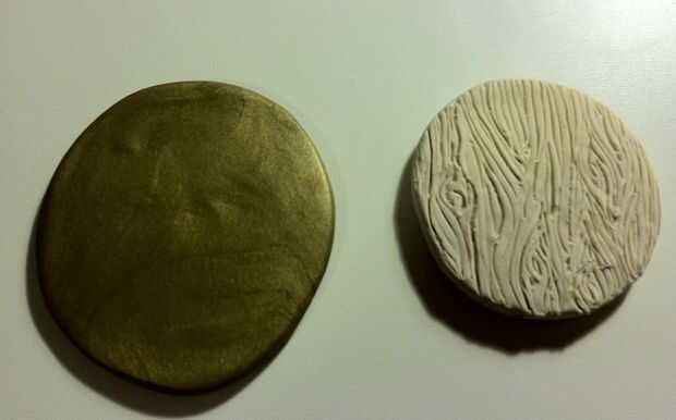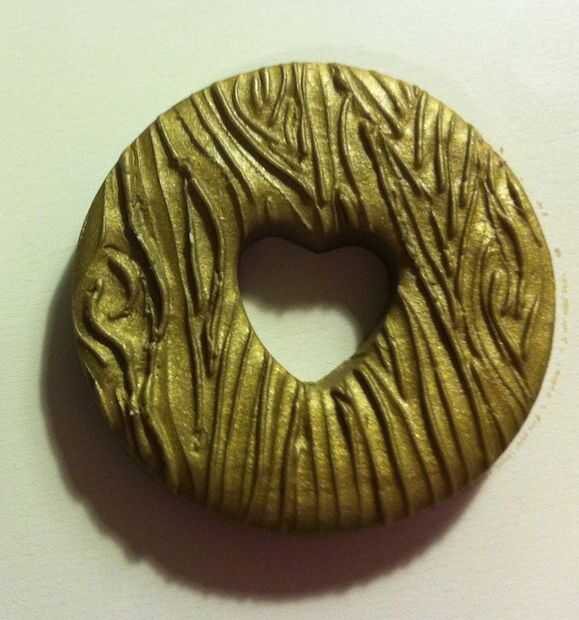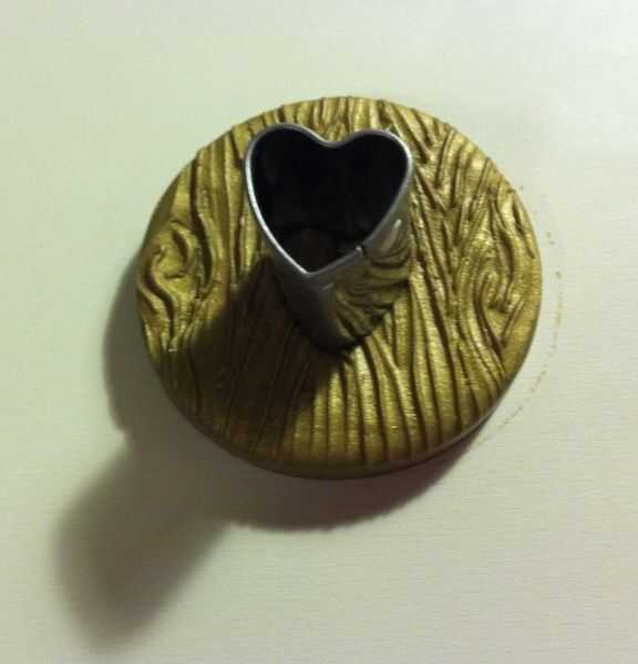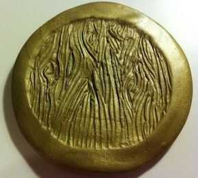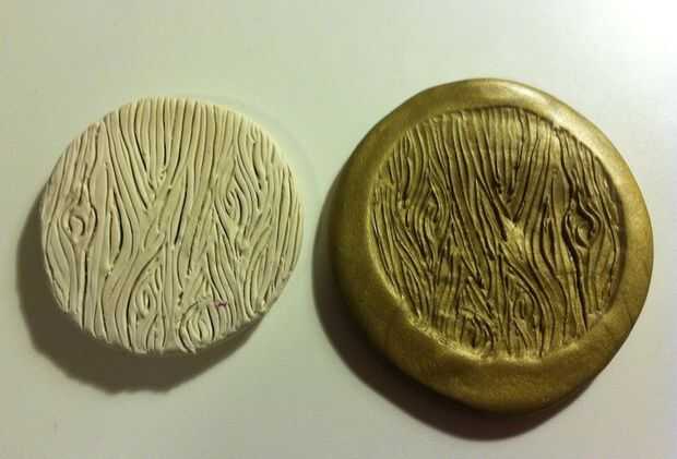 Tomar el sello de vetas de la madera y presione en la arcilla. Retire el sello cuidadosamente un movimiento hacia arriba y presionando ligeramente los bordes de la arcilla hacia abajo y fuera de la estampilla.