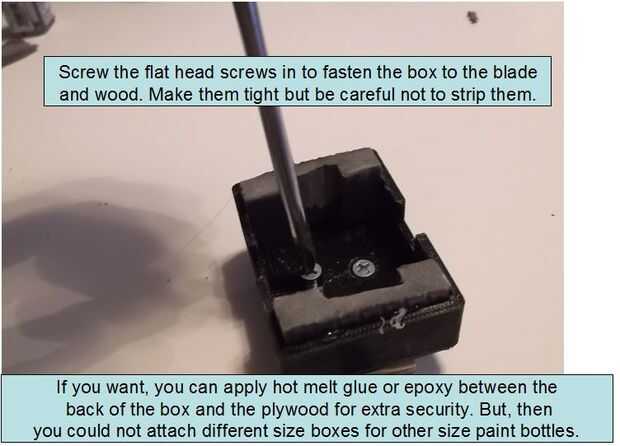 Te preguntarás ¿por qué se une la caja con tornillos y no epoxy o algun otro pegamento? Utilicé tornillos porque podría quiero sacudir botellas para mi pincel de aire o para peaje de mi esposa pintura... pintura totalmente diferente tamaños de la botella. Y tengo que cambiar la caja de la botella para que encajen. Si se pega el cuadro en, usted tiene que construir todo desde cero para diferentes tamaños. Encontré que estos pequeños tornillos en agujeros levemente de tamaño insuficientes en esta madera contrachapada dura sostener bien.
