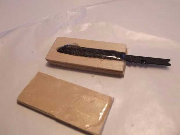 La idea es pegar las tres partes de capas junto con la cuchilla firmemente incrustada en epoxy dentro. Limpiar la cuchilla de aceite o cera con barniz diluyente o removedor de esmalte de uñas (lo mismo) antes de aplicar el epoxi. No quiere esto para despegarse de la hoja en la operación. Realmente podría tener un desastre de salpicaduras de pintura si lo hace. Mezclar el epoxi dos componentes según las instrucciones y usar un montón de ella en la madera. Ahogar completamente la hoja en ambos lados. Ahora ves por qué la "U" forma de corte... Impide que el epoxi agotando cuando se incline hacia arriba con todas las tres piezas juntas en el siguiente paso. No usó pegamento gorila aquí porque hace espuma para arriba y puede desplazar las piezas si no reprimieron bien. Yo también creo que el epoxi es más fuerte (ya sé... algunos no está de acuerdo... Oh, bueno.).