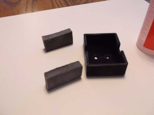 Cortar algunas pocas formas rectangulares de la espuma de goma en la parte superior e inferior de la caja. Deben caber cómodamente con los laterales de la caja y deje pegar un poco... como 1/8" a 1/4" está muy bien. No pegar estas en todo... solo prueba que encajen.