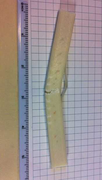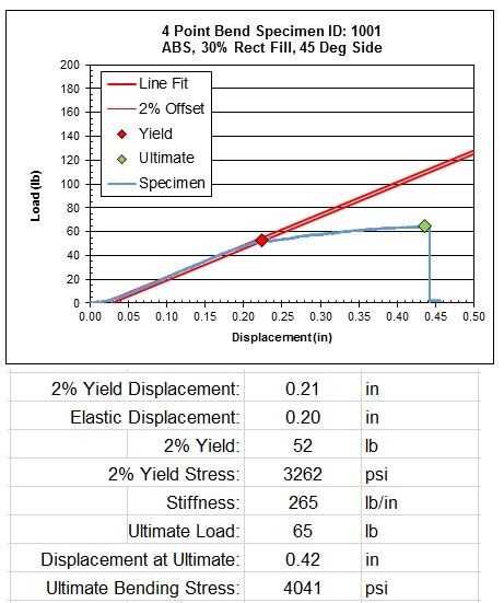 Estima que produciría el espécimen con 58 libras (3300 psi) pero golpeando a los números exactos no era el objetivo de esta prueba. En este punto todos los he probado es que soy bueno en matemáticas o suerte en adivinar números. (Honestamente, me sorprendió la precisión con predije.) Lo realmente interesante está por venir cuando imprimir más ejemplares que son ligeramente diferentes de la primera por lo que puedo aislar el efecto de variables individuales. En ese momento tener un gráfico hará los efectos de cambios menores de diseño muy claro.