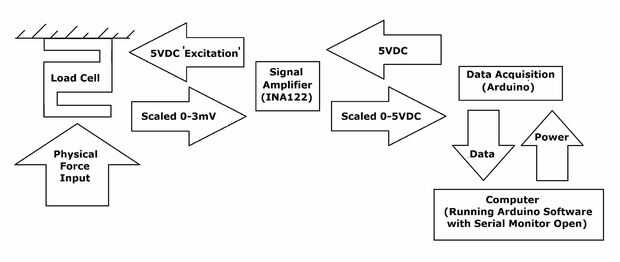 El amplificador es como un muy sensible-metro/ohm-voltímetro que escala hasta la señal Lee. Puede ser utilizado para cualquier puente de puente de wheatstone, RTD o termopar. En este caso el amplificador convierte ese voltaje pequeño (~ 3mv) medida en una tensión más grande escala entre 0-5VDC que puede ser leído por el equipo de adquisición de datos (el Arduino). Puede ajustar la cantidad exacta que escala hasta la señal (ganancia). En este caso se realizan ajustes con un multivuelta ajuste potenciómetro ya es cómo Texas Instruments diseñó este chip.