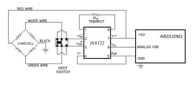 La celda de carga está conectado a la función sólo en tensión o en compresión. Me podria enviar el loadcell 2.5V y la lectura devuelta sería de 0-2.5 en tensión y de 2.5-5 en caso de compresión, pero se perdería la mitad de la resolución de la medición. Como es, si no se puede cambiar entre la tensión y compresión, usando el interruptor DPDT en el diagrama.