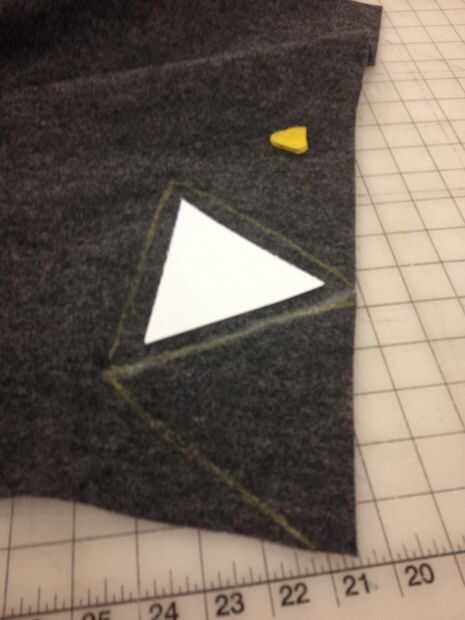 Coloque la plantilla de papel sobre tela de elección (he utilizado fieltro, pero un robusto algodón debe hacer sólo así. La forma puede no sostener así si se utiliza a una tela de un peso más ligero.) y trace una línea alrededor de la plantilla de papel, dejando margen de costura (yo usé 1/4").