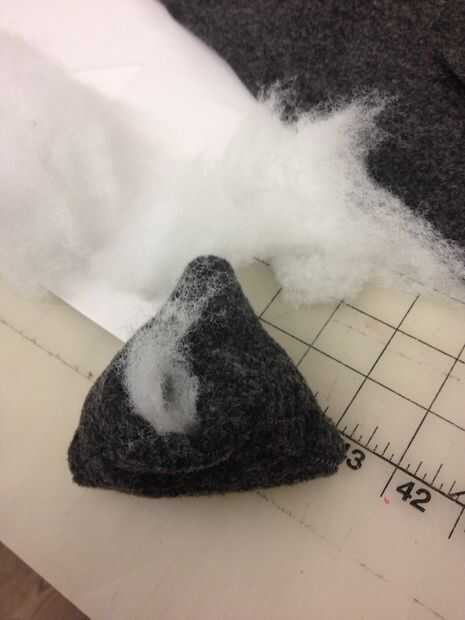 Cuidadosamente vuelta adentro hacia fuera y rellenar con el relleno. Usé una variante de polyfill. Poner bastante para que el tetraedro puede sentarse en cualquier lado y todavía se mira como un tetraedro, pero no tanto que se convierte en bulbo y pierde su forma.