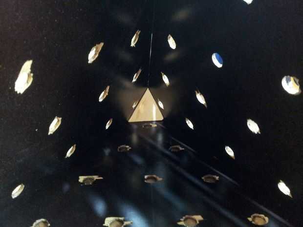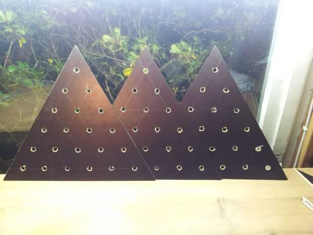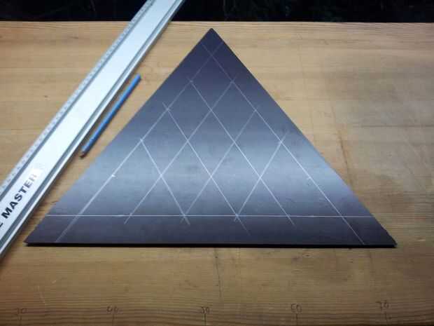 Genauen Zur Bohrung, damit alle LED auch en der richtigen Reihe und korrekten Entfernung zueinander liegen, werden un jeder Seite eines zunächst die sechs äußeren Bohrlöcher angezeichnet de Dreiecks. Danach werden die inneren Bohrlöcher tan ermittelt, wie auf dem Bild zu sehen ist. Einfach ein paar paralelo Linien ziehen, die die äußeren Punkte verbinden. Para ergeben sich von ganz allein die Positionen der Löcher, die auf den Kreuzungspunkten dieser Linien liegen. Wichtig: Abstand Der zu den Seiten der Dreiecke muss así groß gewählt werden, dass sich die innenliegenden LEDs de der Teile von zwei aneinanderliegenden Dreiecken nicht en die Quere paremiológico, da sich die Dreiecke sonst nicht mehr nahtlos aneinandersetzen lassen.
