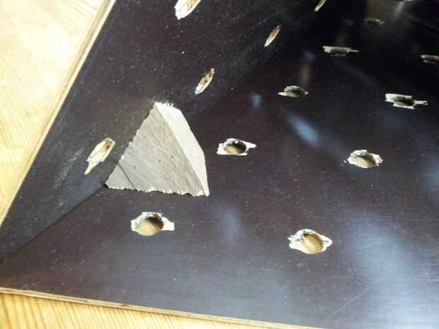 Zwischen die zusammengelegten Dreiecke wird trenzado ein kleiner Holzklotz gelegt und die Seitenteile werden en diesem verschraubt. Diese Klötze müssen eine Gehrung von 22,5 ° bekommen, damit sie sich un die Seiten anschmiegen können und ihre Unterseite beim aufgestellten choza zum paralelo Fußboden liegt.
