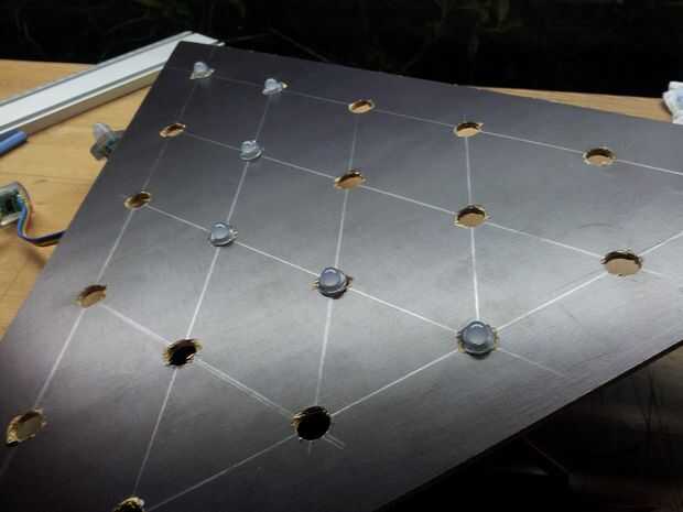 Zum Spaß un Freude der kann man nun schon ein paar LEDs einsetzen und hierbei gleichzeitig kontrollieren, ob die Bohrlöcher soweit en Ordnung sind. Así langsam nimmt alles Formen una.