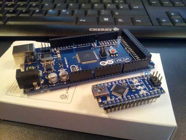 Hier sieht man einmal deutlich den Unterschied zwischen dem Arduino Mega aus der ersten und dem Arduino Nano aus der zweiten versión des Tetrahoden. Die erste versión musste noch mit extern untergebrachter Steuerung und Akkupack auskommen, die über ein langes Kabel mit der Einheit LED verbunden wurde.