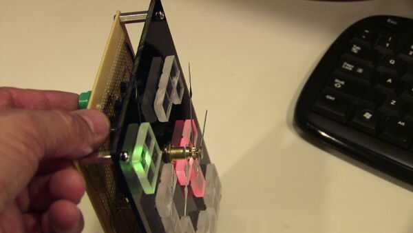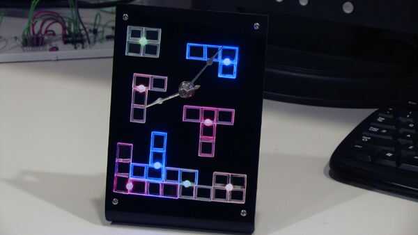 El soporte es un pedazo de negro brillante acylic.  Las formas TETRIS están hechas de una hoja de arylic gruesa de 1/4".  Corté la hoja en tiras y piezas entonces pegan juntos.  Tienen los orificios de 5mm perforados en ellas que son sólo lo suficientemente profundos como para adaptarse a la punta de un LED dentro.  La platina es un propósito multi PC Junta de Radio Shack.  El kit de reloj es montado en el soporte y utilicé stand-off a suficiente distancia para colocar la placa del circuito tras el reloj.