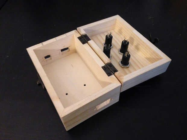 Finalmente he puesto la placa Arduino y conexiones en una caja de madera. Puede ver un paso intermedio con todos los agujeros perforados en el cuadro y el botón insertado y finalmente la vista externa e interna.