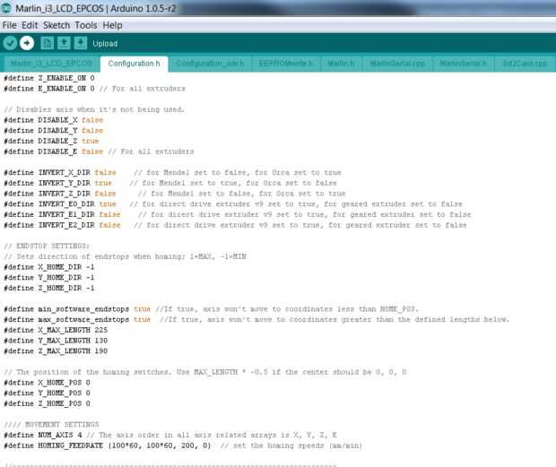Una vez que Marlin instalado, abra el archivo "Marlin_i3_LCD_EPCOS.ino" y haga clic en la ficha "Configuration.h" desplazarse a "#define X_MAX_LENGTH"