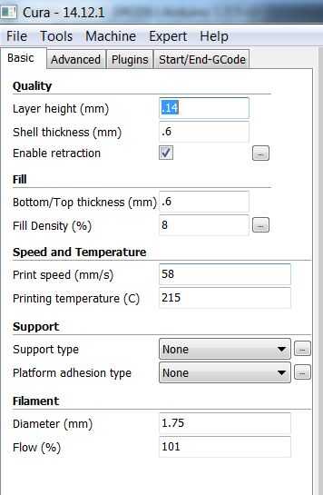 Yo uso Cura 14.12.1 como un motor de impresión y corte. Las versiones más recientes bajo 15 generación parecen fijarse más abajo a Ultimakers, por lo que recomiendo descargar un software de Cura 14. Usted puede encontrar todas las versiones aquí.