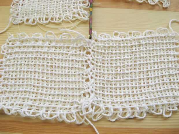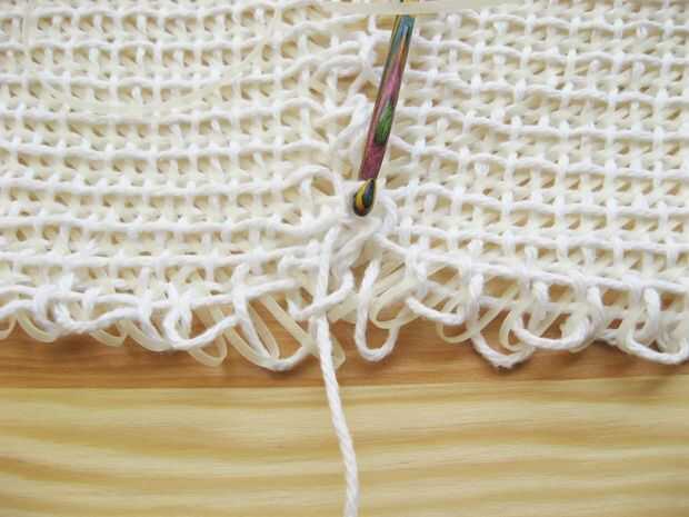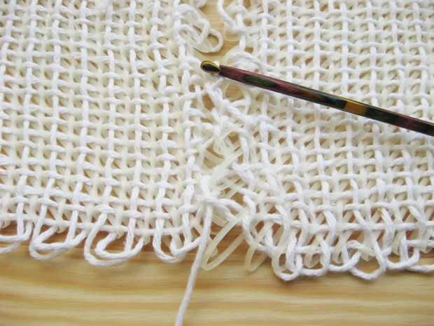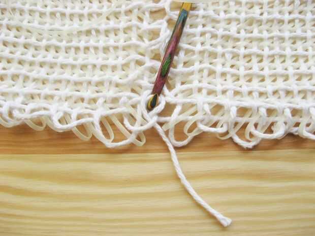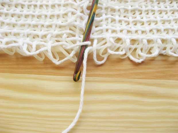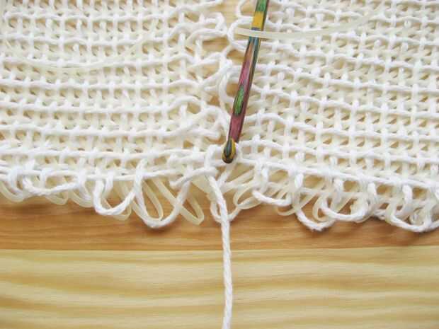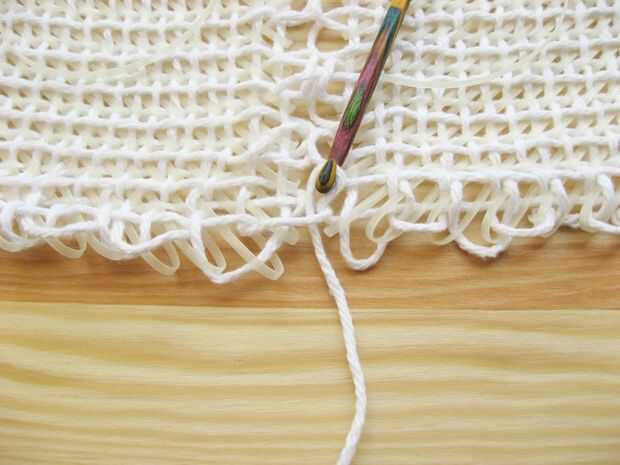 Una forma fácil para asegurar el último lazo es enviar una hebra de hilo a través de ella (antes de tejer en).