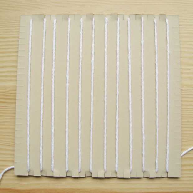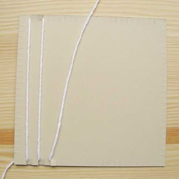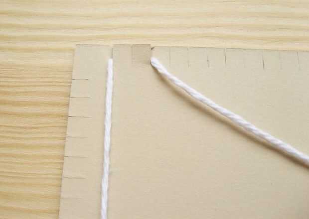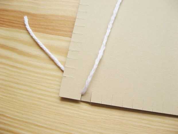 Correr el hilo hasta el cartón y meter en la muesca opuesta, teniendo cuidado de no tensar el hilo de. Debe ser tan suelta como puede ser mientras todavía permanecer recta.