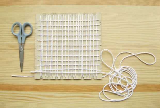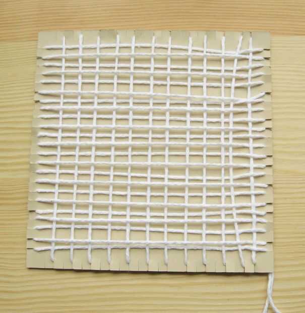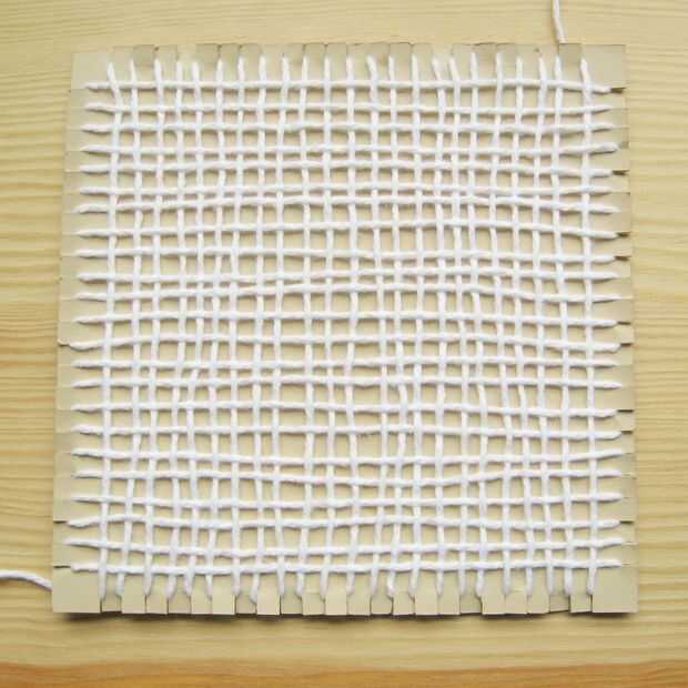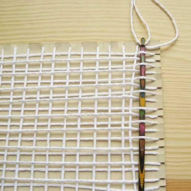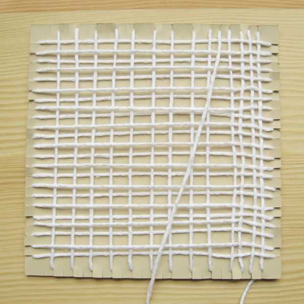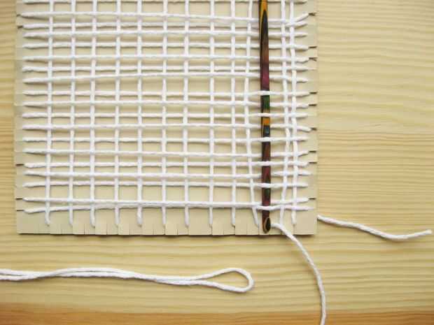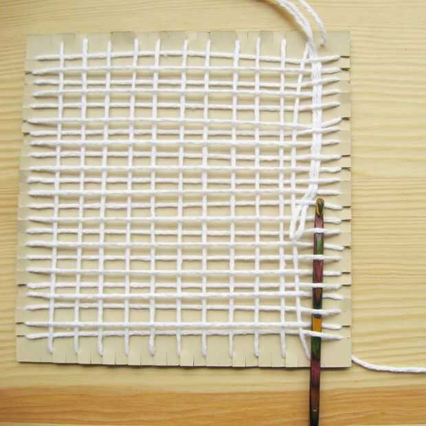 Comenzando en el centro del tablero, tejer el ganchillo sobre y debajo de las hebras enfrente de lo que ya está allí.