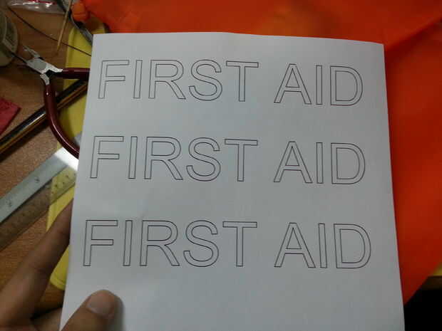 2. una plantilla de lo que le gustaría imprimir / estampar con pintura acrílica. Mina dice "Primeros auxilios" en letra mayúscula. Para facilitar el corte de la plantilla hacia fuera, elegí una fuente con un contorno. Sólo Google "Fuentes de contorno", descargar, instalar, imprimir y listo.