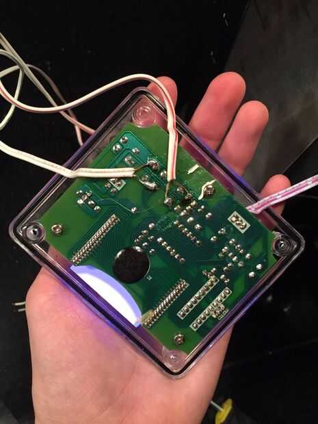Una vez que la Junta fuera, usted necesitará identificar donde está conectado el botón 'on'; como puede ver en el primer plano arriba, mina fue sólo dos contactos soldados hacia el lado opuesto. Accidentalmente de soldar los cables a los contactos del botón de "cambio de minutero", así que tuve que rehacerlo (por eso tengo un alambre rizado no conectado a nada).