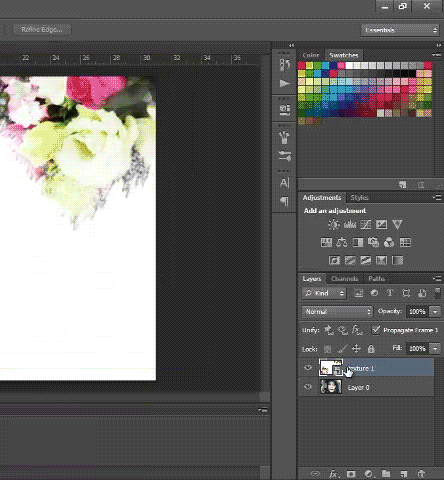 Añadir la textura que has descargado, simplemente arrastrando o por copiar y pegar. Para este tutorial he utilizado textura 1. Textura 2 funciona de la misma. Rasterizar la capa (ver imagen). Esto lo hacer por derecha haciendo clic en el icono de capa denominado "Textura 1" y seleccionar "Rasterizar".