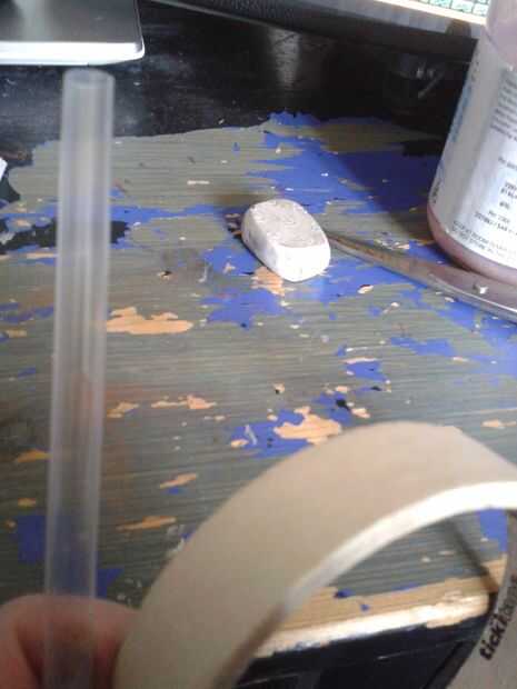 Ahora usted va a necesitar su paja. Tómelo y corta una pequeña sección de un extremo en un ángulo, por lo que parece la foto de arriba o la imagen de referencia. Para medir hasta qué punto la paja se sobresalen el barril y que cubra mucho (más quizá un centímetro) con cinta de enmascarar. Recortar en la parte superior donde está la sección inclinada y pintura plata.