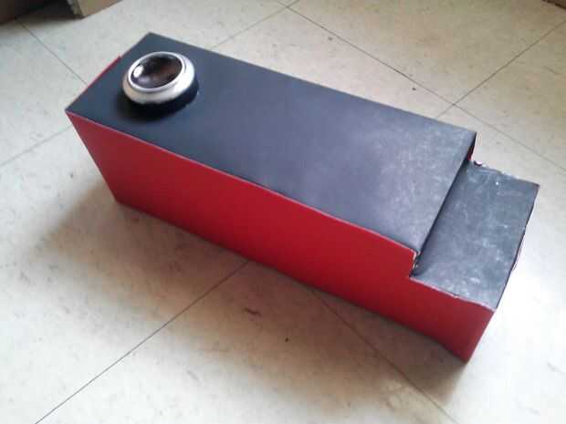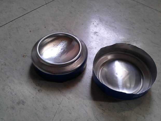 Corte la parte inferior de cada lata. No necesita ser perfecto, sólo necesita poner el plano en nuestra caja. Los bordes y el interior de la can de color negro o cubierta con papel negro. Deje el borde plata incoloros. Cinta adhesiva o pegamento caliente a la parte superior de las cajas.