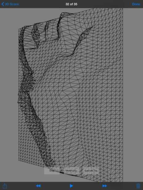 Los puntos más fuertes de la aplicación trimensional son el precio y la facilidad de uso, la aplicación se instala por $1, la descarga tarda menos de 10 segundos, un ambiente oscuro es todo lo que necesita. Las exploraciones no son grandes pero pero suficiente para el precio que pagamos. El equipo hizo un montón de experimentar con diferentes entornos y configuraciones, pero incluso con las condiciones perfectas, los análisis no son lo suficientemente precisos como para utilizar como datos de referencia. Otro problema es que no hay ajuste de escala adecuada, el modelo puede ser deformado o distorsionado.