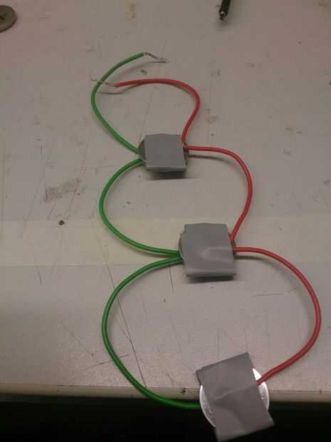 Cómo hicimos esto se muestran en la imagen. Utilizamos alambre eléctrico para conectar todos plus - y menos-los polos de las baterías. Los cables se mantienen en su lugar la cinta de aislamiento.