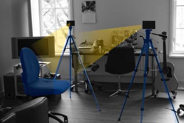 Ahora es el momento para hacer nuestro propio video en orden para poder crear nuestro propio holograma. Decidimos hacer un holograma de una de nuestras cabezas. Para el aspecto 3D del holograma probamos el rodaje de diferentes lados, de esta manera es posible pasear por el holograma. El ajuste de la película se muestra en la imagen. La habitación tiene que ser muy oscuro, de esta manera que no habrá ningún fondo en el video de lo contrario esto haría que el holograma plano. La luz del flash debe ser por lo tanto la única fuente de luz, celebramos este derecho bajo la cabeza. Utilizamos dos cámaras, una para el frente de la película y otra para el lado de la película. Porque no usamos mucho movimiento en el vídeo además de movimientos faciales y cambios de luz, era posible para la parte posterior de la cabeza la película después de filmar la parte delantera (no asi al mismo tiempo) y el video del lado del espejo.